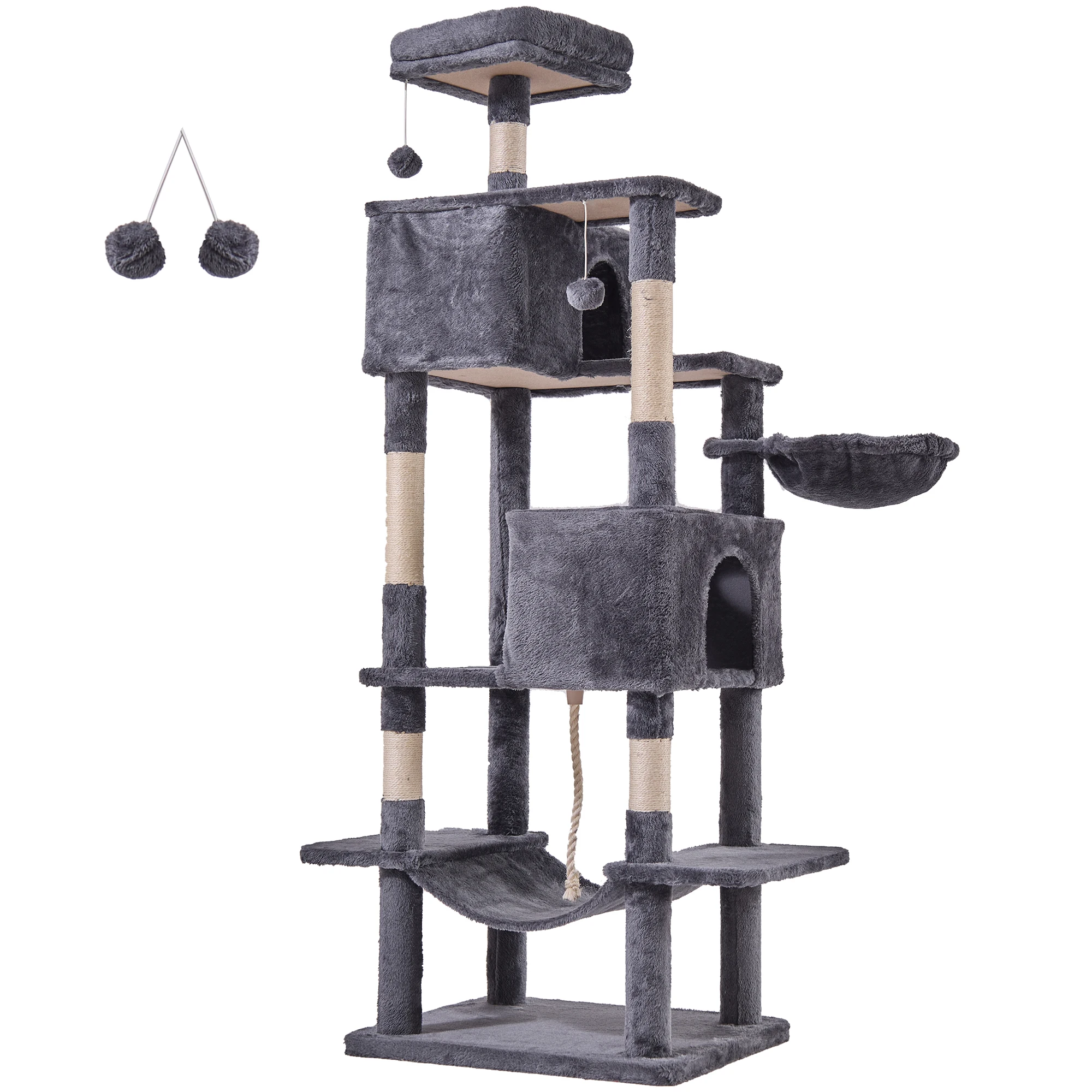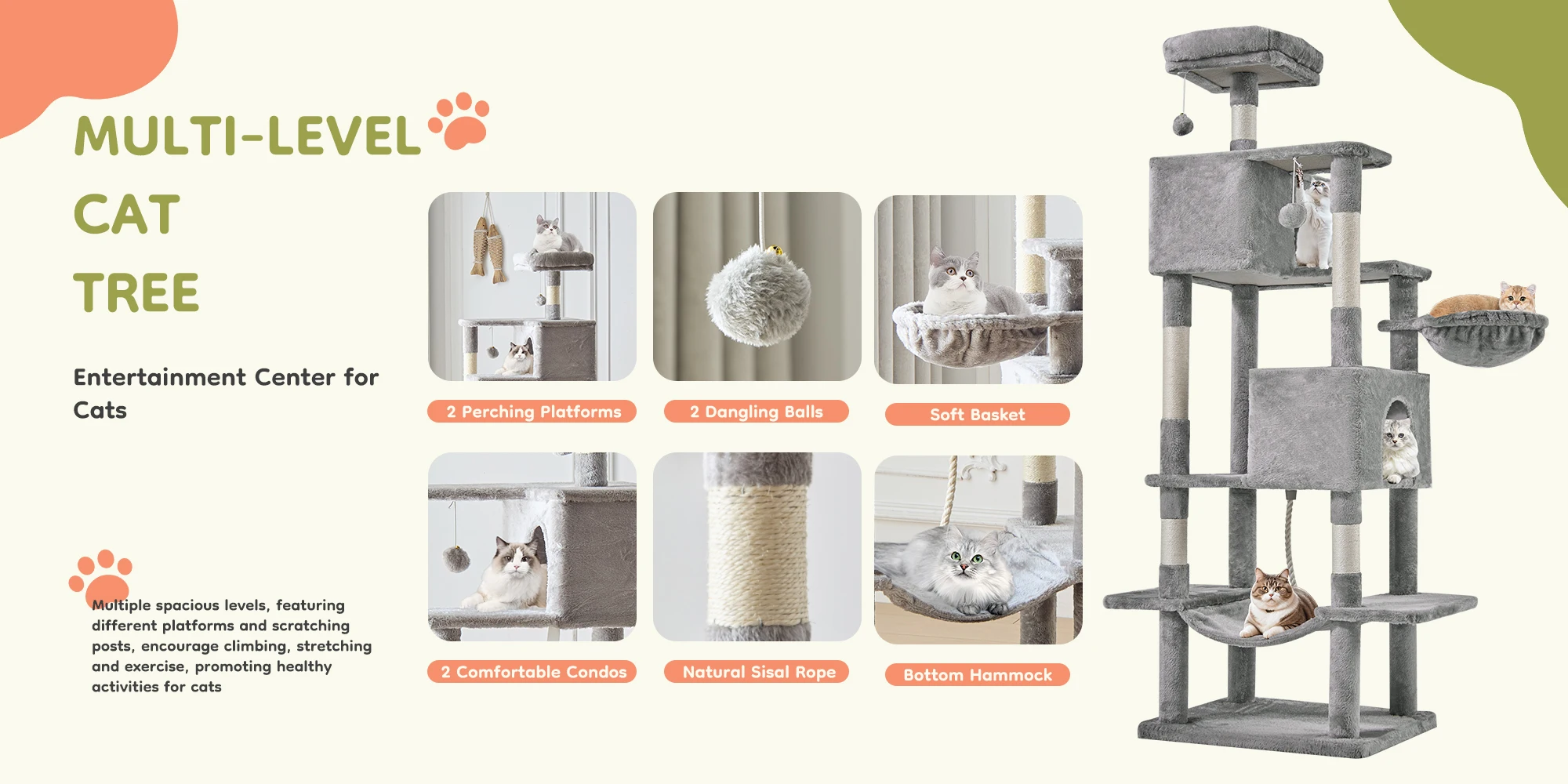 Multi-Level Cat Tree: Multi-zone design caters to feline play needs, specifically crafted for multi-cat households. 66 inch large cat tree accommodates 3-4 cats for simultaneous play and relaxation. Features include 2 cat condos, 2 swinging balls, extended platform, hanging basket, hammock, and scratching posts, satisfying your cat's instincts to climb, perch, and hide while delivering endless fun