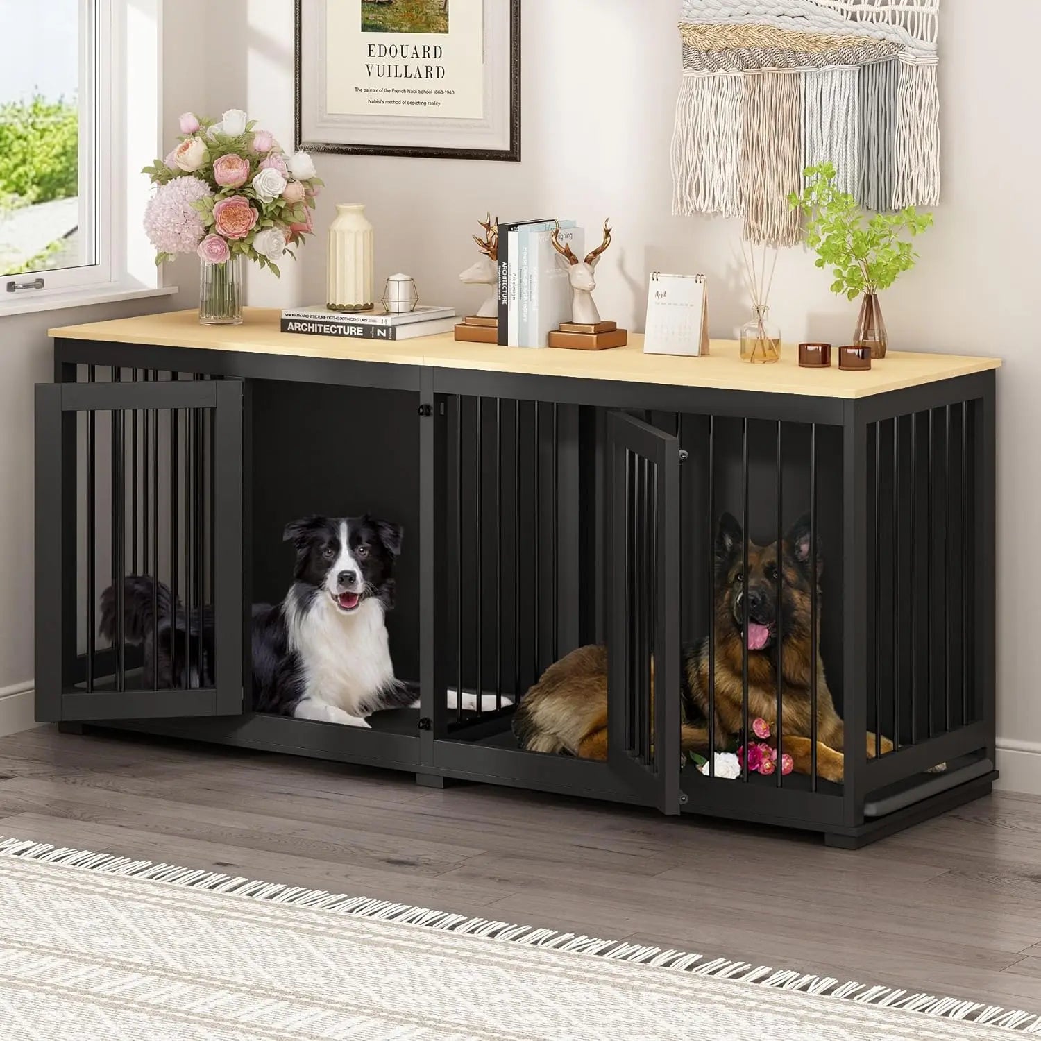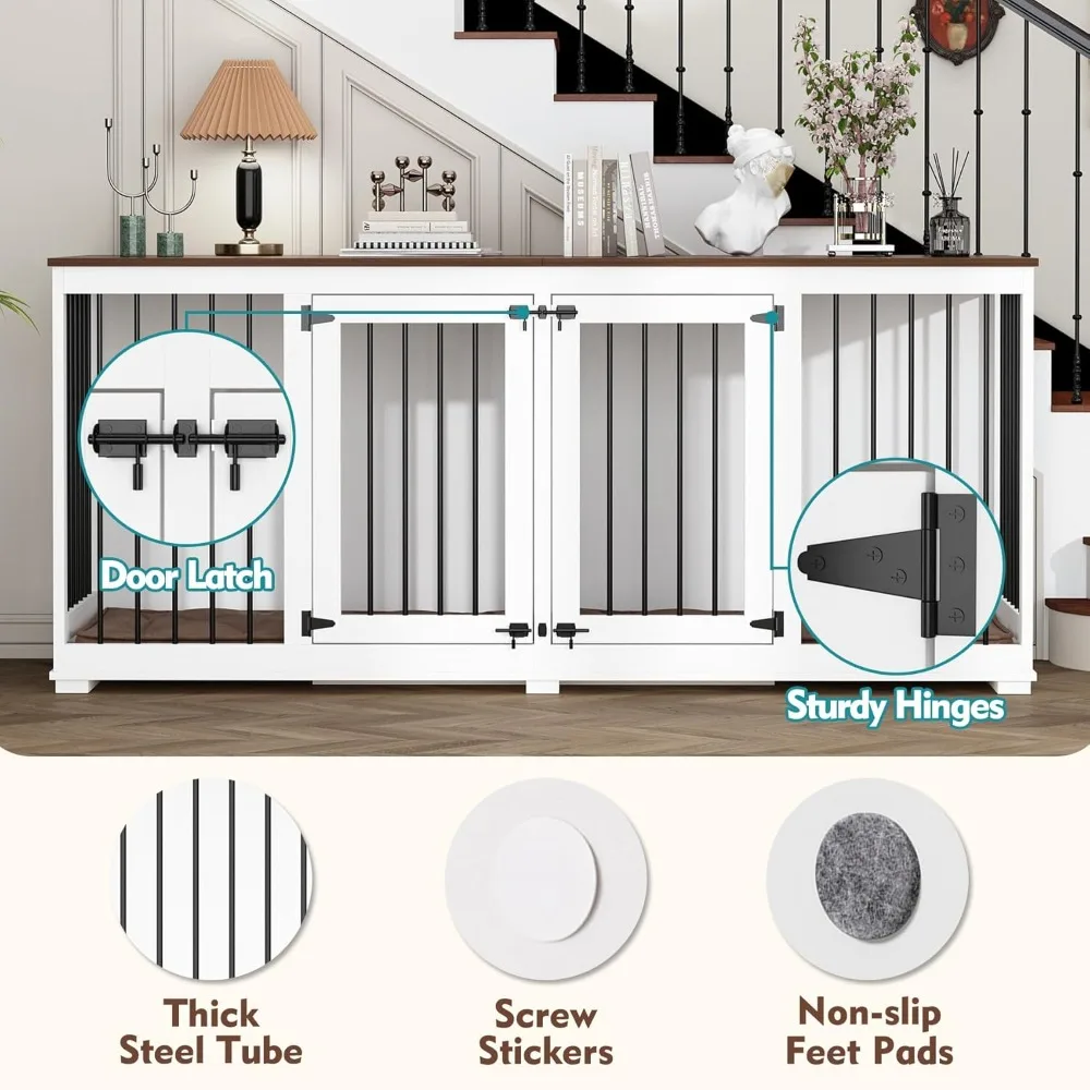 - 【REINFORCED BASE】 The plate base of the large dog crate furniture for 2 dogs provide a comfortable and non-stuck sleeping place for your furry friend. You can also place cushions to create a more enjoyable bedroom for your dog.