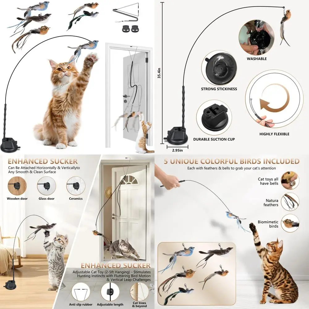 Cat Toys for Indoor Cats, Interactive Bird Cat Toy Self-Holding Suction Base with 5 Replaceable Birds, Door Hanging String, Feat