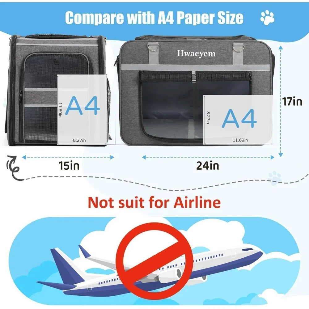 - 【ATTENTION】: Please do not choose your carrier only based on weight. In order to choose the right dog travel carrier size for your pet, it is recommended that you measure your pet's length, height and weight before purchasing. This large pet carrier bag cannot be placed under an airplane seat. (NOT AIRLINE APPROVED.)