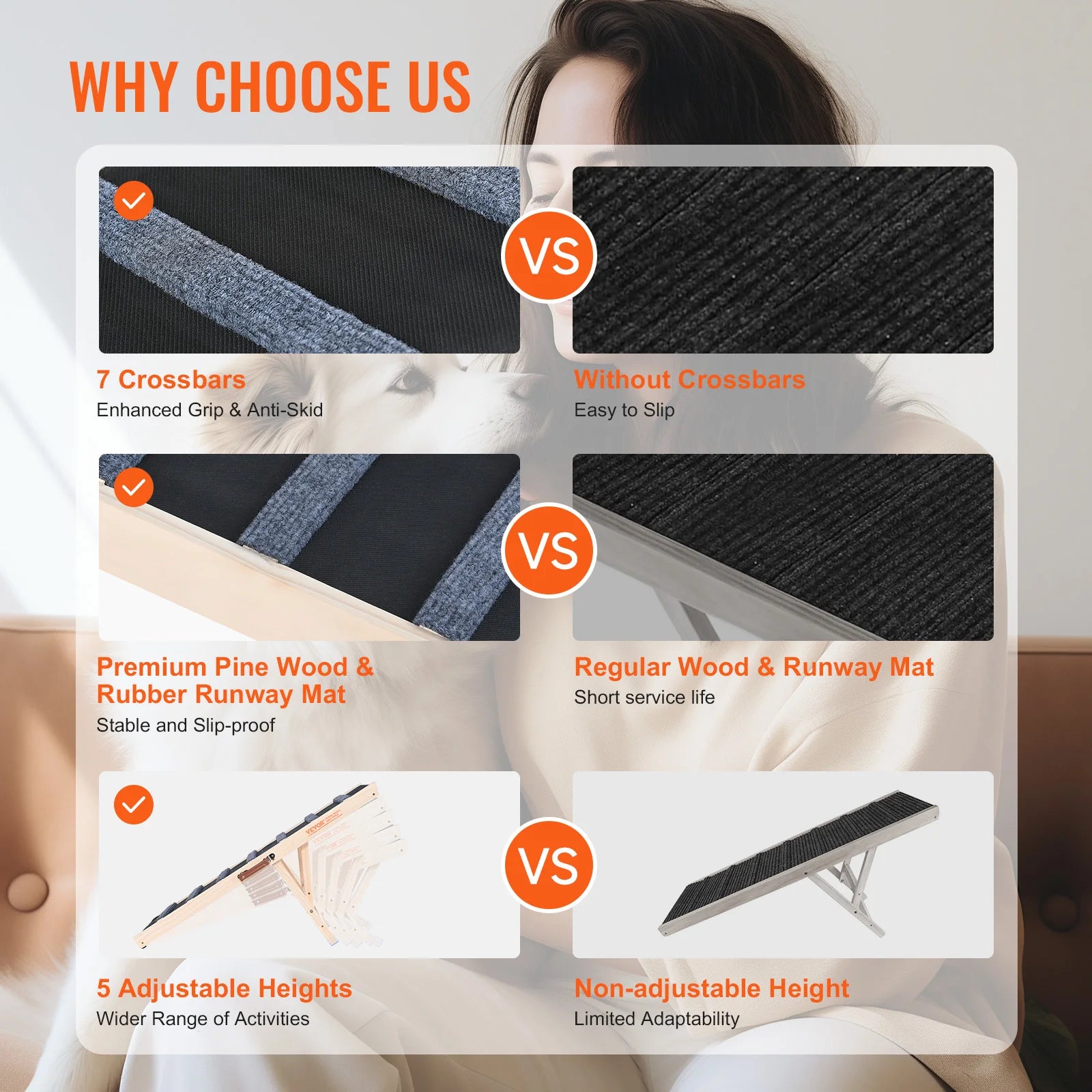 Robust and Stable Construction: Made from high-quality pine wood, this adjustable dog ramp is designed to be sturdy and can support pets weighing up to 100 lbs. The soft rubber footpads at the base provide added stability, ensuring your pet's safe ascent.