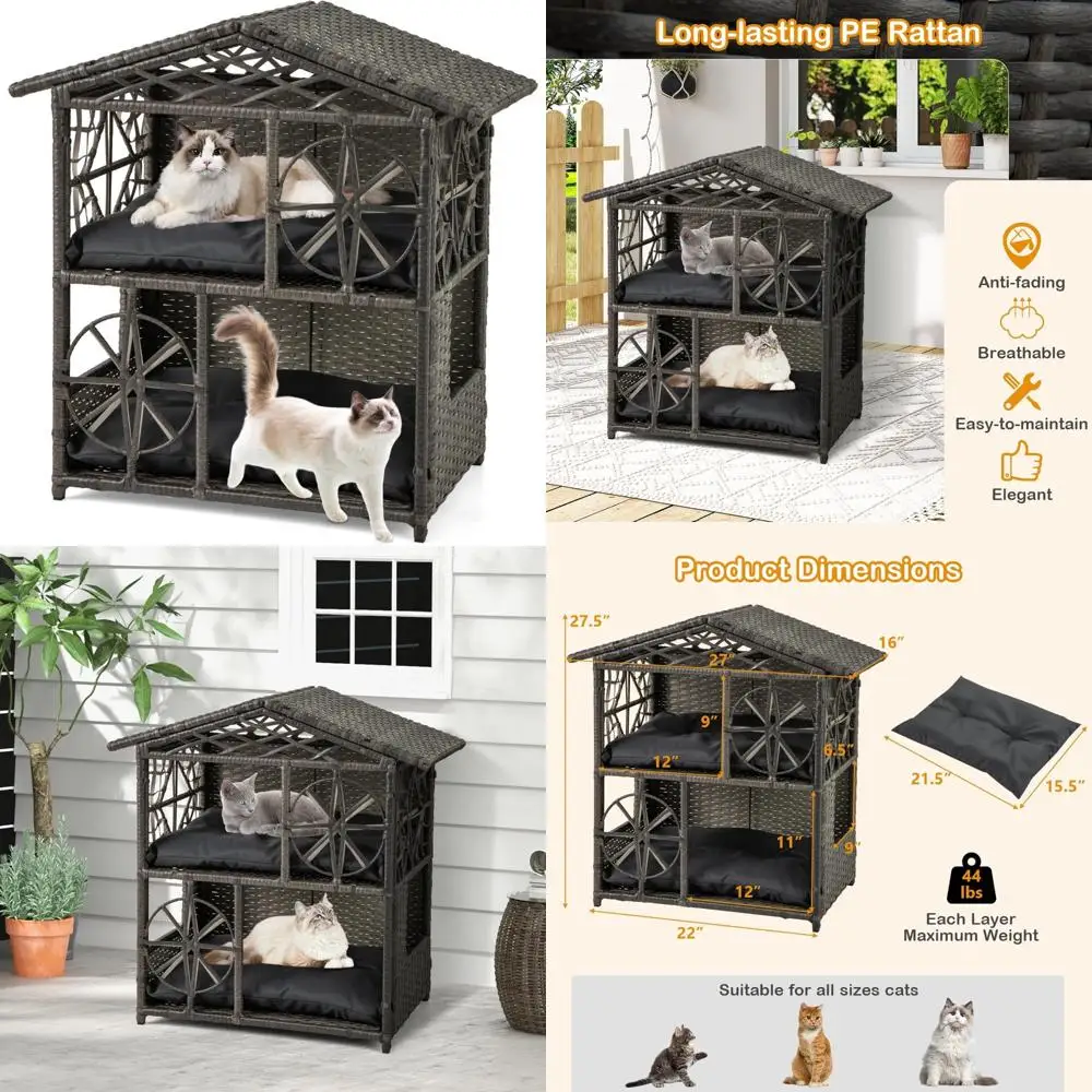 This cat house is a large, two-tiered shelter designed for cats and rabbits of various sizes. It measures 27 inches in length, 16 inches in width, and 27.5 inches in height. The design includes two wide entrances and side windows, making it easy for pets to move in and out freely while also promoting playful interactions. The structure is made from premium PE rattan, which is resistant to fading and easy to maintain. This makes it a durable addition to both indoor and outdoor spaces, such as porches or decks. The material is also breathable, providing a cozy environment for your feline companions. Each level of the cat house comes with a cushioned pad for enhanced comfort, and the covers are zippered, making cleaning a breeze. The design is exquisite, featuring a slanted roof and a classic oriental charm with vintage wheels and geometric patterns woven from faux rattan, giving it a timeless appeal. The cat house is sturdy, supported by reinforced metal pipes and non-slip pads, with a total weight capacity of 88 lbs. The elevated legs prevent water accumulation, further enhancing its durability.
