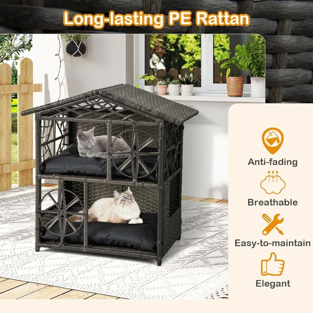 Two-Tier Rattan Cat House with Removable Cushions and Wicker Cat Cave Bed for Aesthetic Pet Shelter